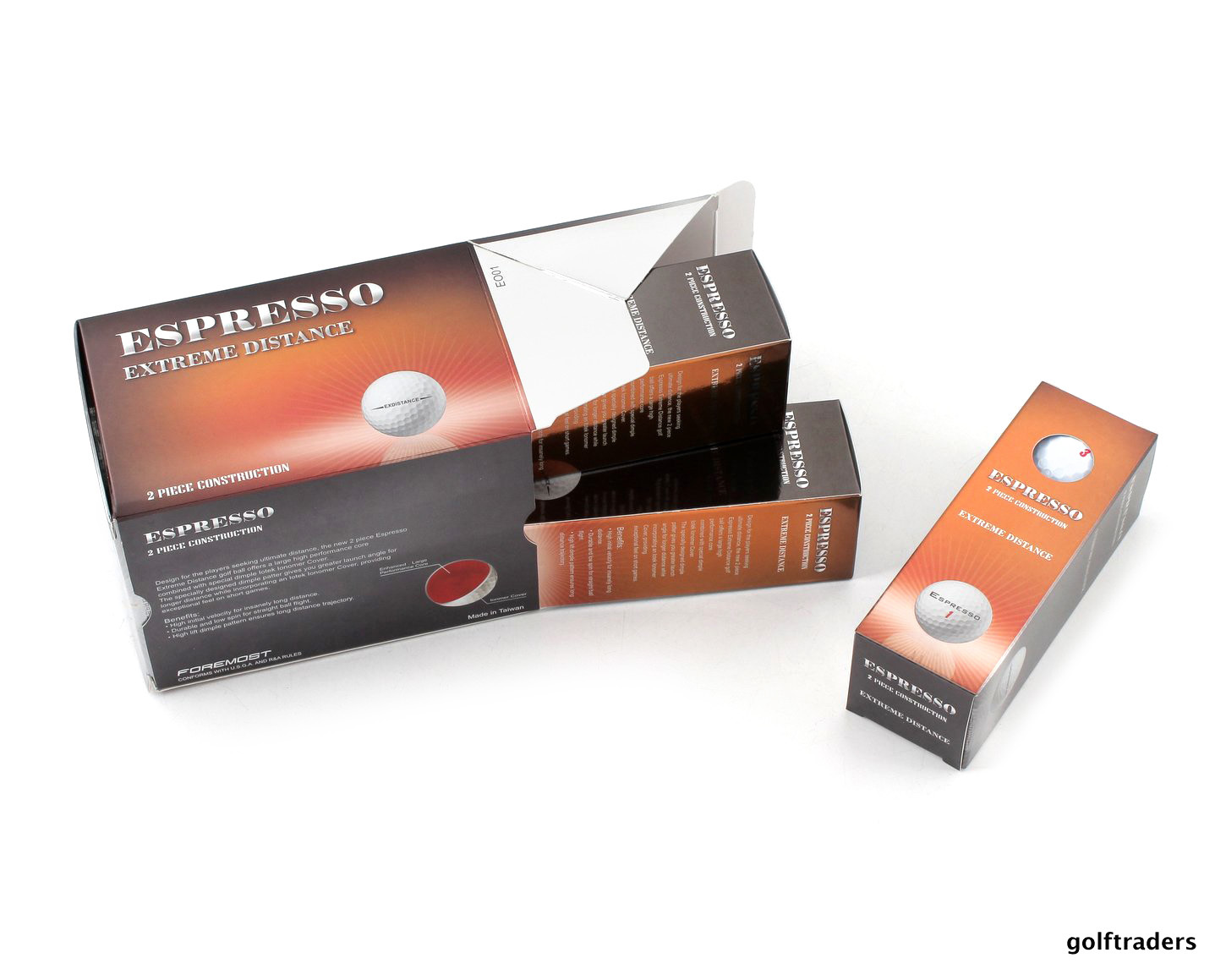 FOREMOST ESPRESSO EXTREME DISTANCE GOLF BALLS 20 x 12 BOXES MEGA PACK - NEW #E5768 - 2 PIECE CONSTRUCTION - LARGE HIGH PERFORMANCE CORE - SPECIAL DIMPLE LOTEK LONOMER COVER - DURABLE LOW SPIN LONG DISTANCE STRAIGHT FLIGHT - CONFORMS WITH U.S.G.A. AND R&A RULES - TOTAL 240 BALLS |